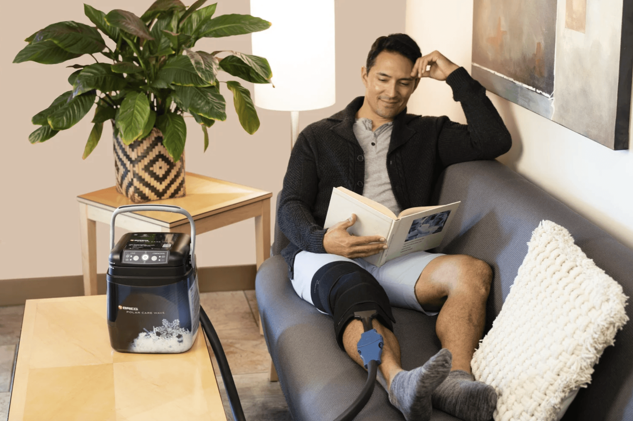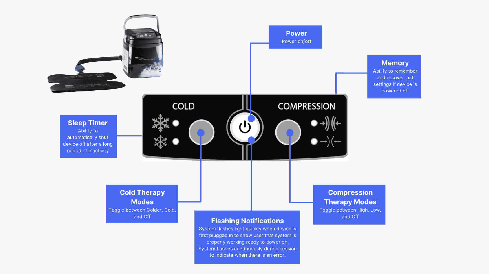 Breg is the largest manufacturer of cold therapy products in the U.S. The Polar Care Wave is a cold and compression therapy system designed to reduce swelling, manage pain, and accelerate healing after surgery or injury. Users use a keypad interface to control therapy modes and respond to device alerts during recovery.