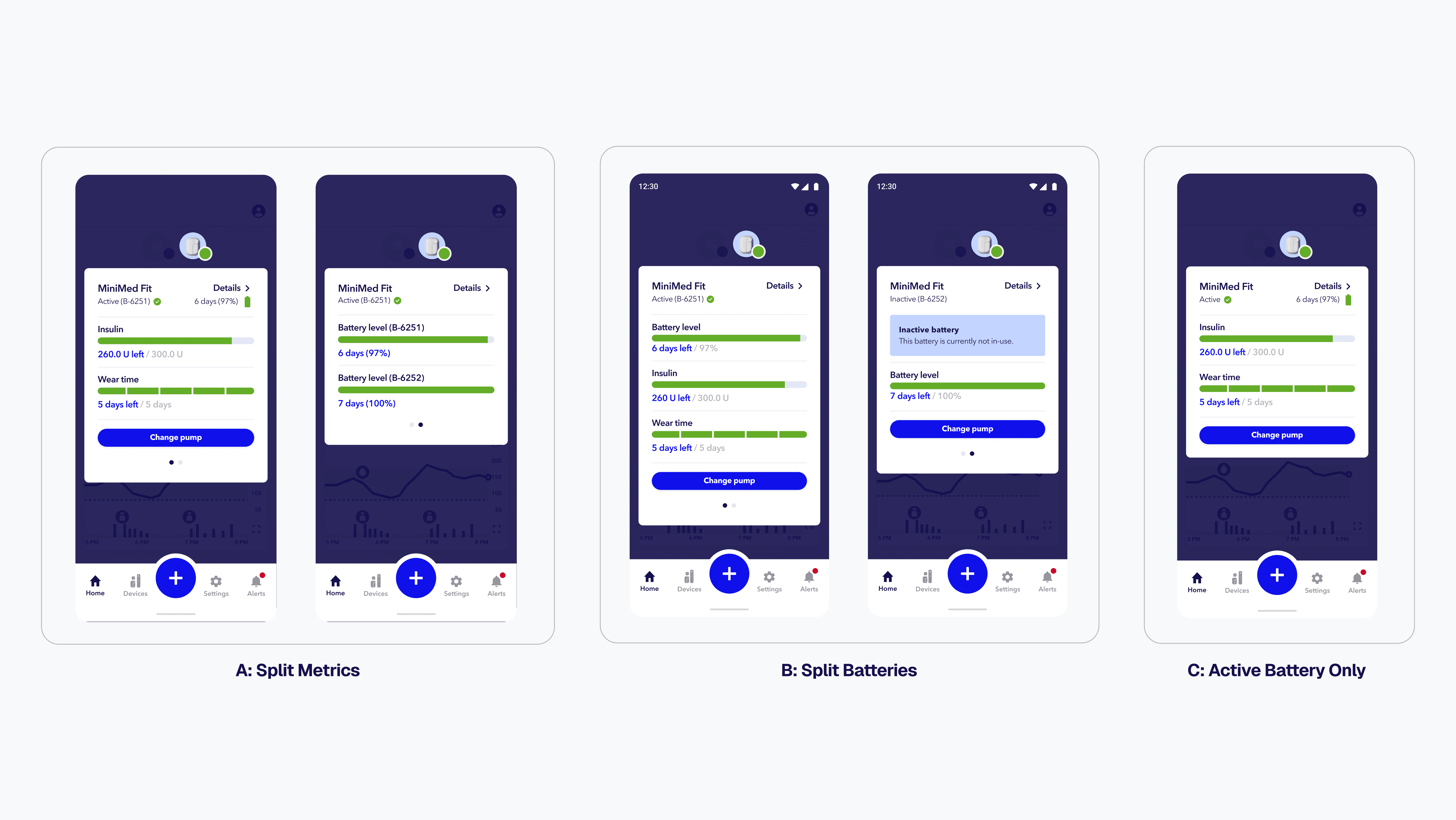 The system contains two batteries: an active battery powering the pump and a secondary backup battery that activates when the active battery is depleted. Device info is shown so the user knows when to prepare to change their pump to avoid a pause in insulin delivery. The challenge was determining how to present the most critical information without overwhelming the primary interface. We explored different layouts: