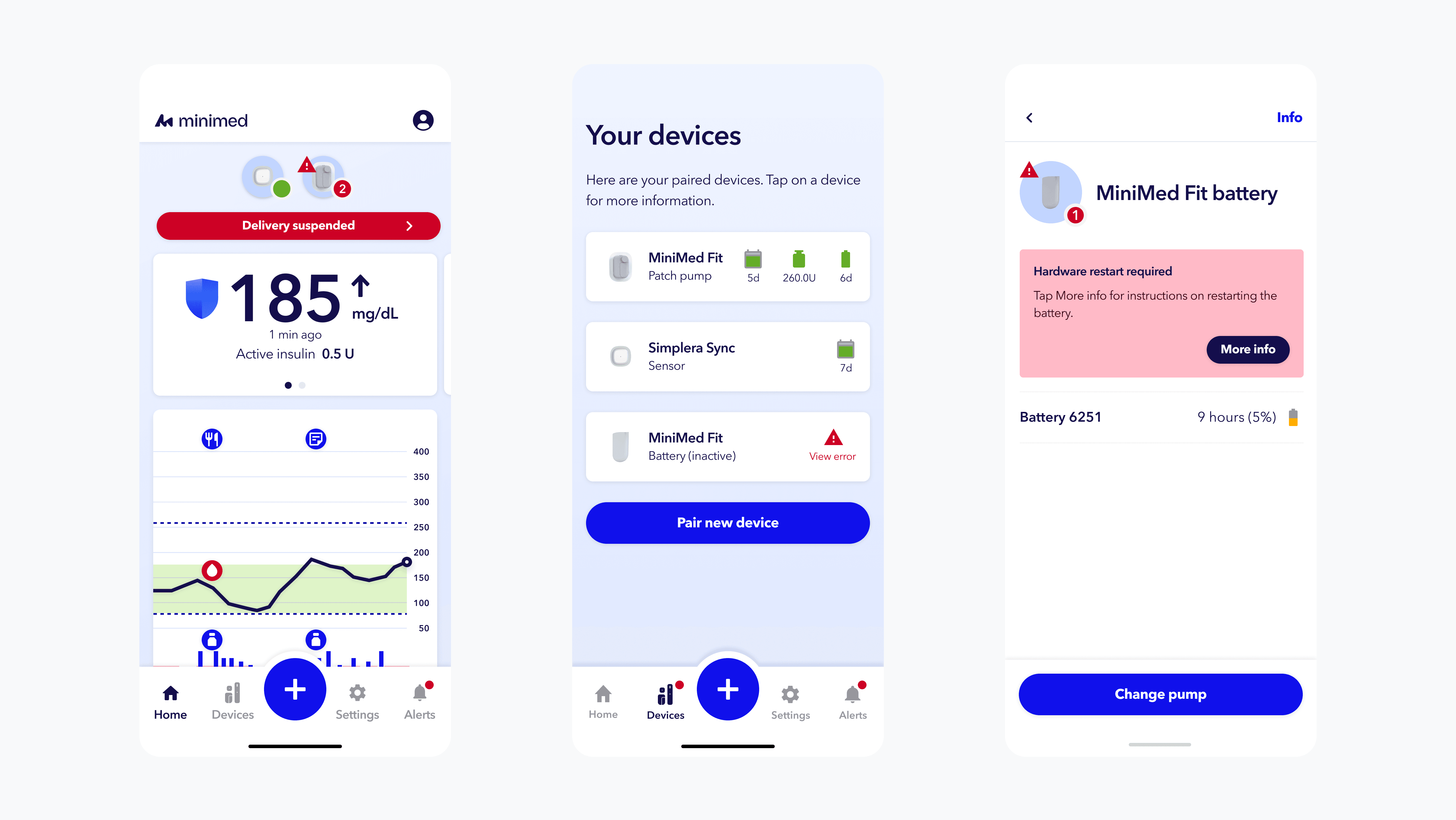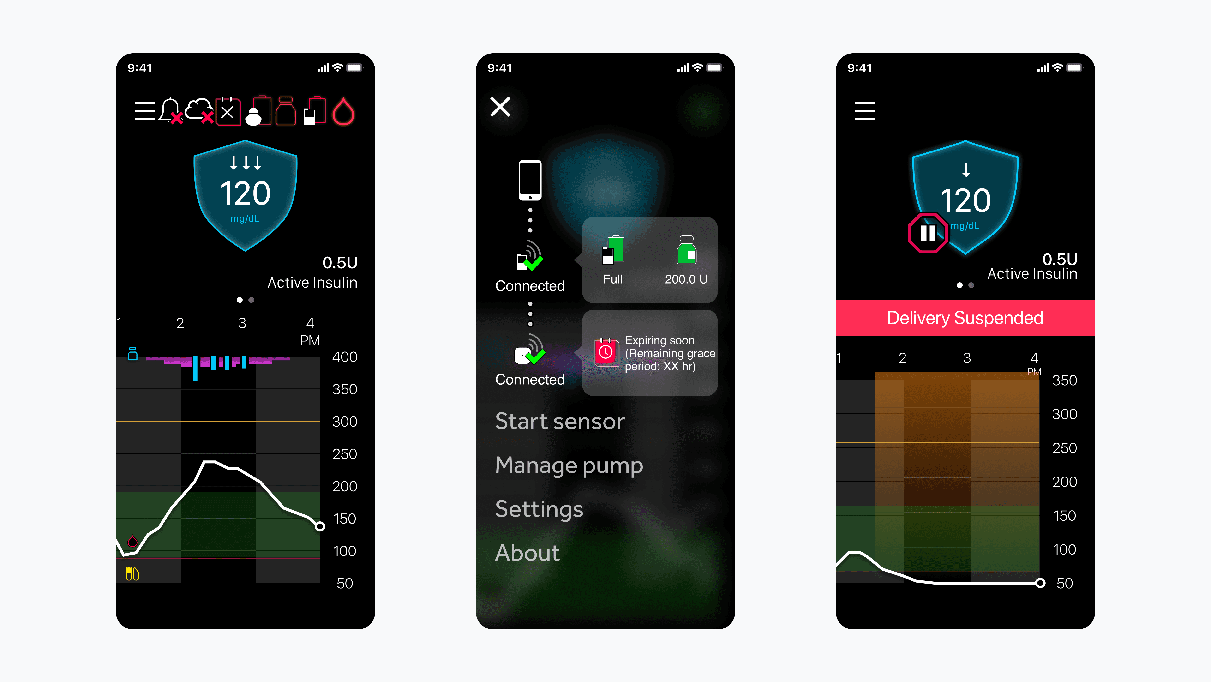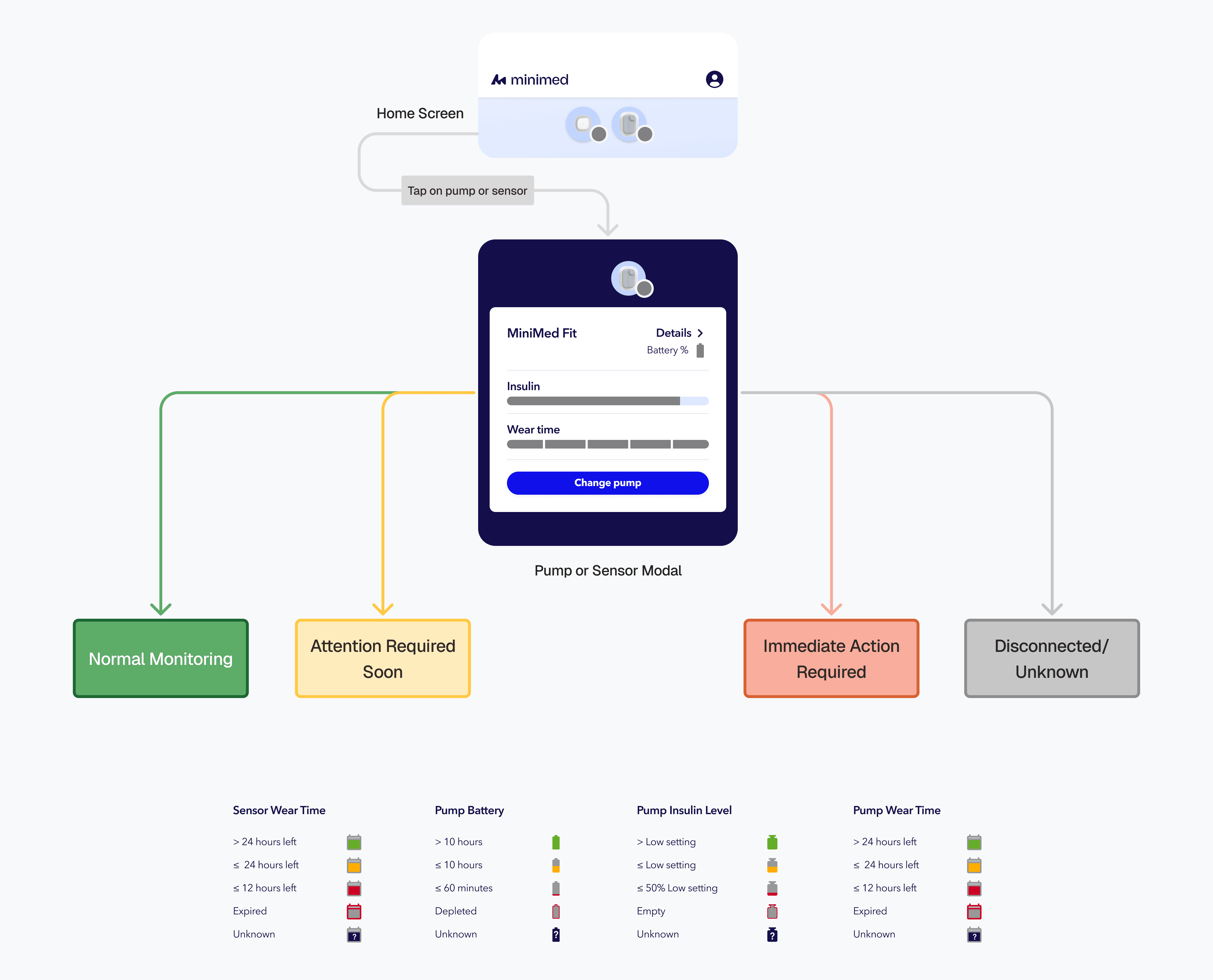 As the only company that builds both the insulin pump and continuous glucose monitor (CGM) in-house, Medtronic manages a fully integrated therapy ecosystem within a single app. I drove the design of features within the startup, device management, error handling, notifications, therapy/prescription settings, and alert preferences flows. I partnered with systems engineering to define requirements and constraints, collaborated with clinical and safety stakeholders to ensure regulatory alignment, validated solutions through human factors testing, and delivered production-ready specifications for development.